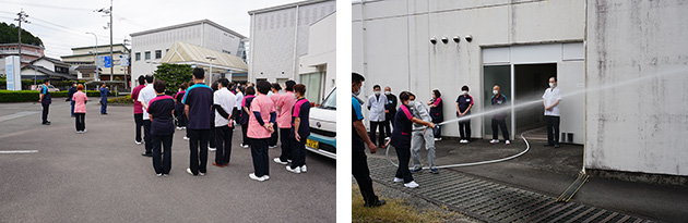 消防訓練実施。避難訓練。消火器・消火栓を使用した初期消火の訓練。